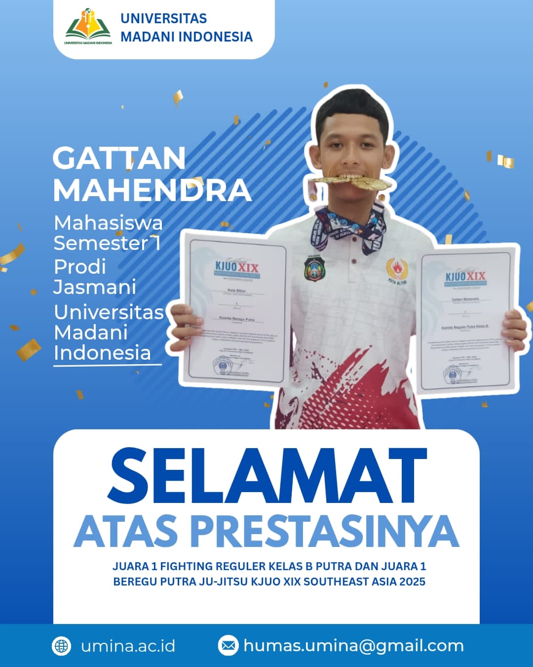 “Kami sangat bangga atas capaian Gattan Mahendra. Ini menjadi bukti nyata bahwa mahasiswa UMINA tidak hanya unggul dalam bidang akademik, tetapi juga dalam prestasi olahraga. Semoga prestasi ini menginspirasi mahasiswa lainnya untuk terus berjuang dan berprestasi,” ujar Prof. Zainuddin.