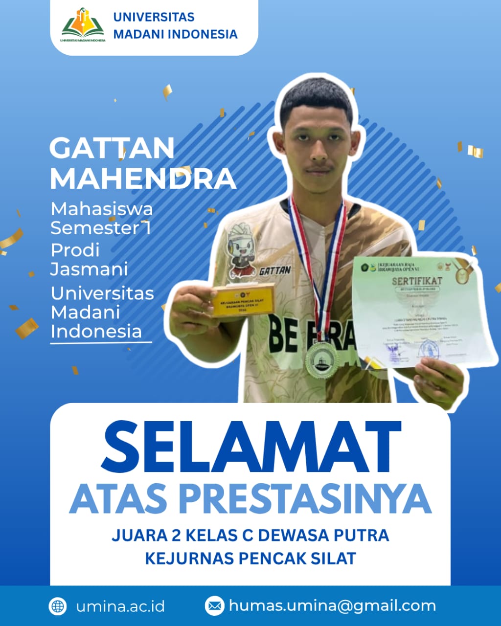Malang, Oktober 2025 — Dua mahasiswa Universitas Madani Indonesia (UMINA) berhasil mengukir prestasi membanggakan dalam ajang Kejuaraan Nasional Pencak Silat Raja Brawijaya Open VI yang digelar pada 2–5 Oktober 2025 di GOR Pertamina Universitas Brawijaya, Malang.