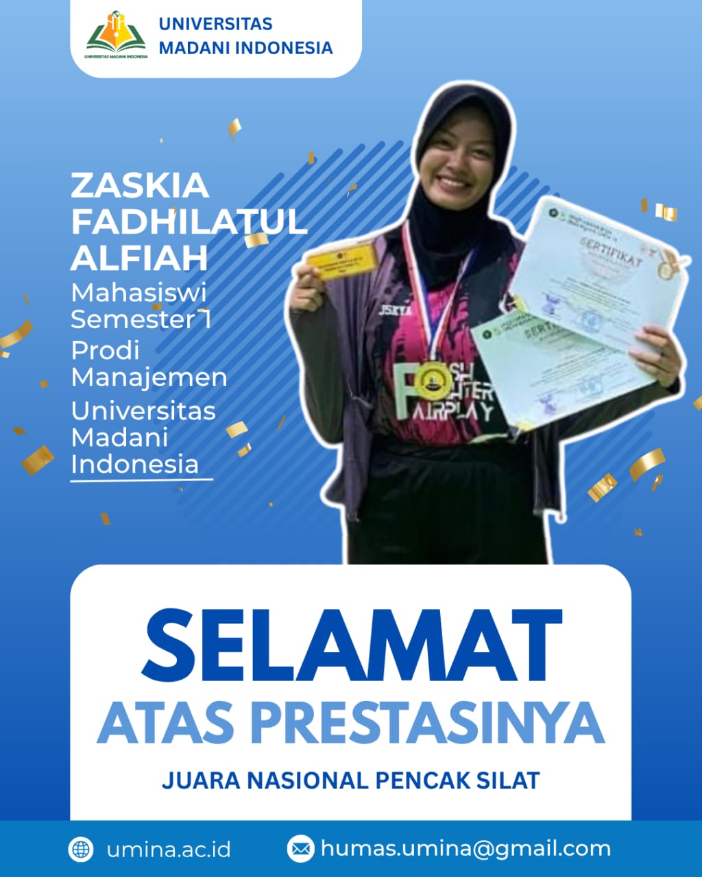 Mahasiswi semester 1 Jurusan Manajemen, Zaskia Fadhilatul Alfiah, sukses meraih gelar Juara Nasional setelah tampil gemilang di kategori tanding. Sementara itu, Gattan Mahendra, mahasiswa Program Studi Pendidikan Jasmani, Kesehatan, dan Rekreasi (PJKR) angkatan 2025, berhasil meraih Juara 2 Kelas C Dewasa Putra.